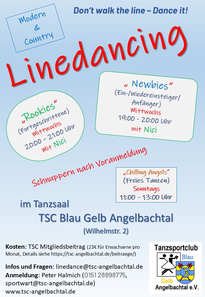 Der TSC Blau-Gelb Angelbachtal lädt zum Line Dance ein! Unter dem Motto „Don’t walk the line – dance it!“ sind alle willkommen, ob Anfänger, Wiedereinsteiger oder Fortgeschrittene. Jeden Mittwoch gibt es zwei Kurszeiten: Von 19 bis 20 Uhr für Newbies und Einsteiger mit Tanzleiterin Nici, anschließend von 20 bis 21 Uhr für Rookies und Fortgeschrittene. Wer einfach mal hereinschnuppern möchte, kann dies nach Voranmeldung tun.